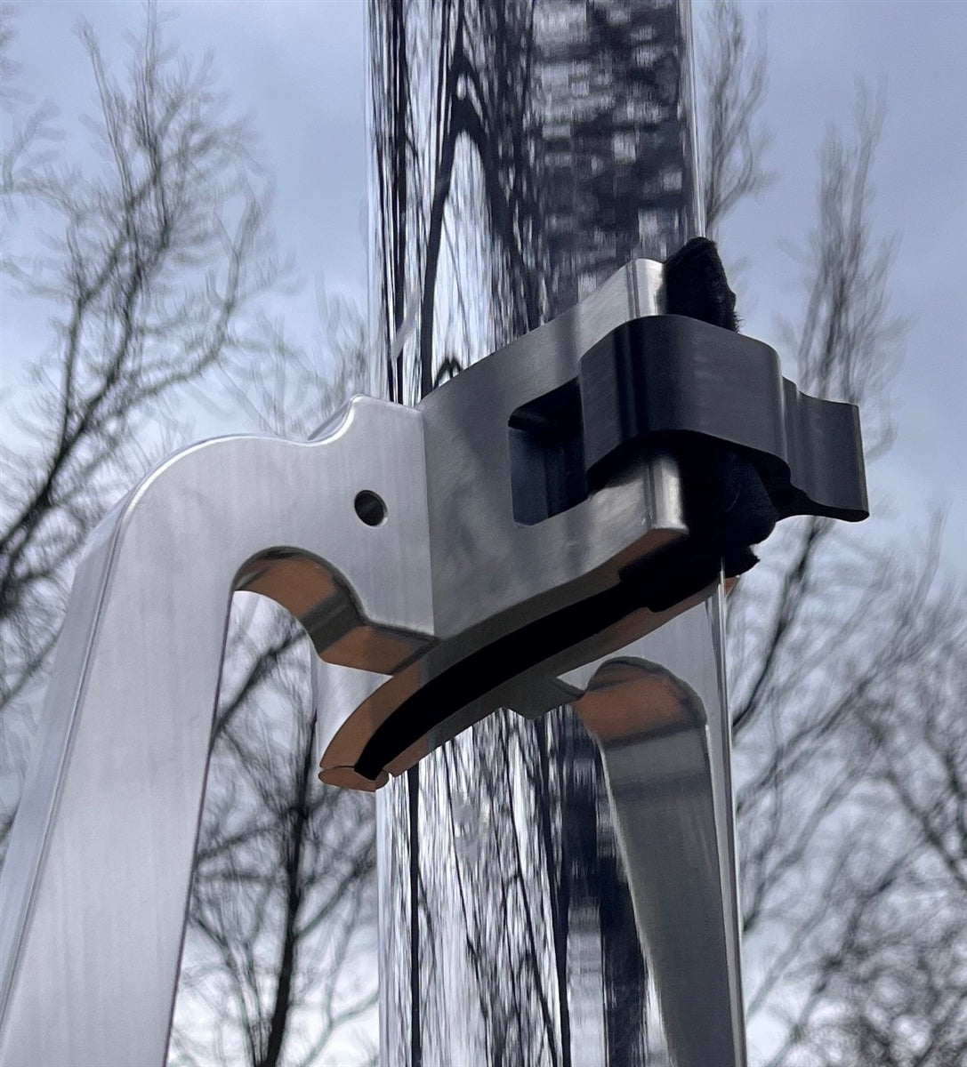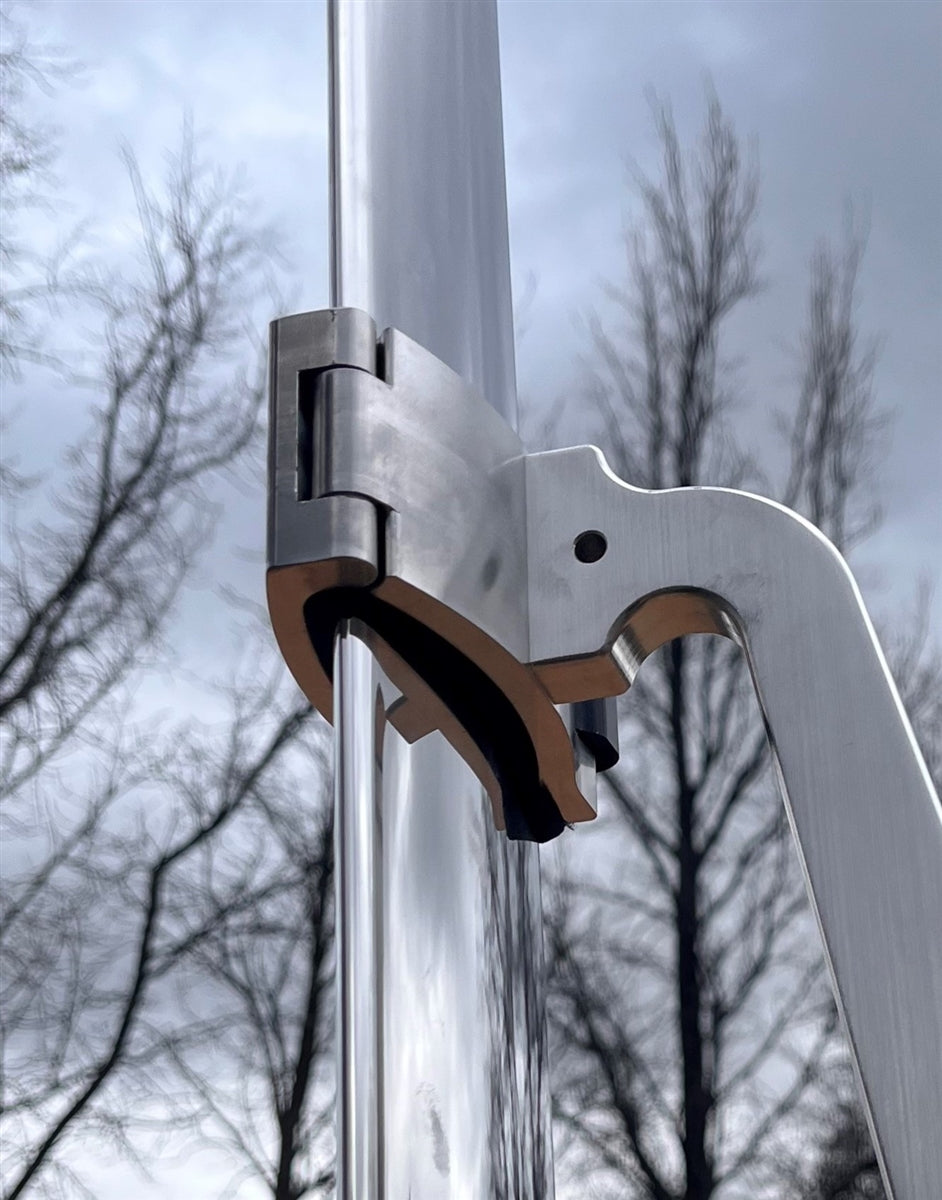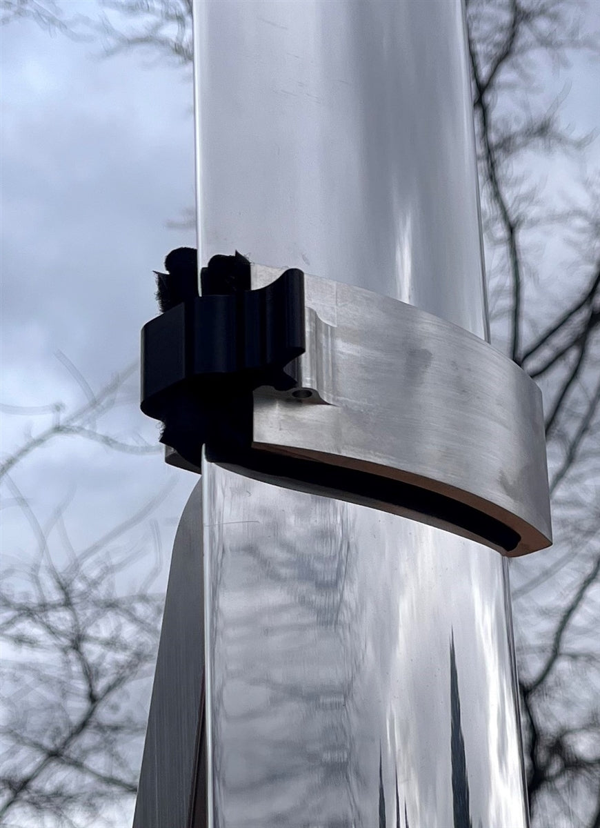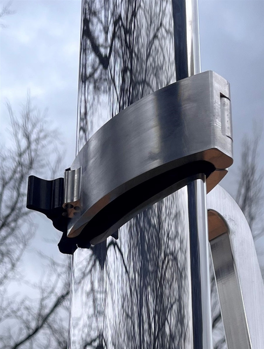 This strut locker fits onto the seat rest / strut grabber arm to replace the velcro strap on the hydrofoil racks, providing a very easy to use & positive lock onto the strut.